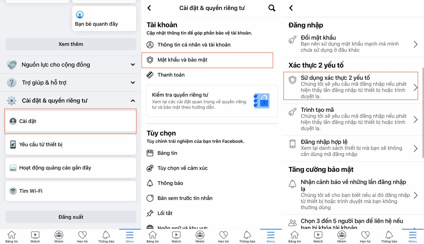 Settings (Cài đặt) > Security and Login (Mật khẩu và bảo mật) > Use two-factor authentication (Sử dụng xác thực 2 yếu tố). Bằng cách này, tài khoản Facebook cá nhân sẽ được an toàn hơn trước những cuộc hack nick từ kẻ xấu.
