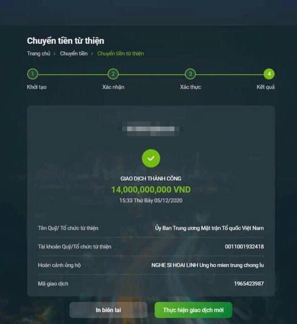 Mới đây, trên mạng xã hội bất ngờ xuất hiện một bức ảnh chụp màn hình điện thoại cho thấy nghệ sĩ Hoài Linh đã chuyển tổng số tiền 14 tỷ đồng đến Ủy ban Trung ương Mặt trận Tổ quốc Việt Nam với lời nhắn "Nghệ sĩ Hoài Linh ủng hộ miền Trung chống lũ". Ngày giờ được ghi khi chuyển khoản là ngày 5/12/2020, tức sau khoảng gần một tháng sau khi nghệ sĩ Hoài Linh thông báo ngừng tiếp nhận tiền quyên góp.