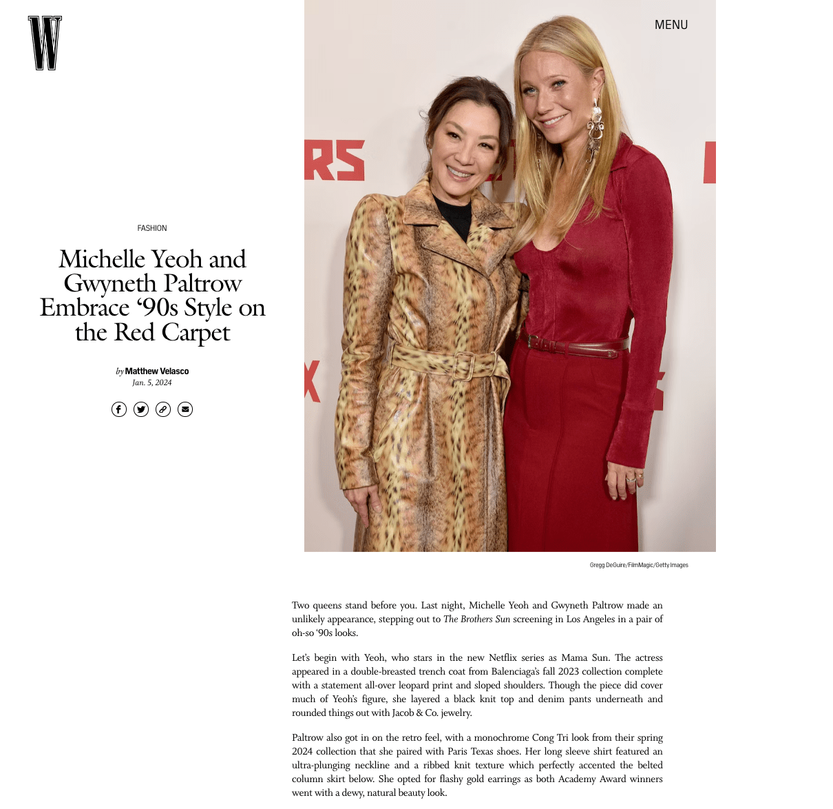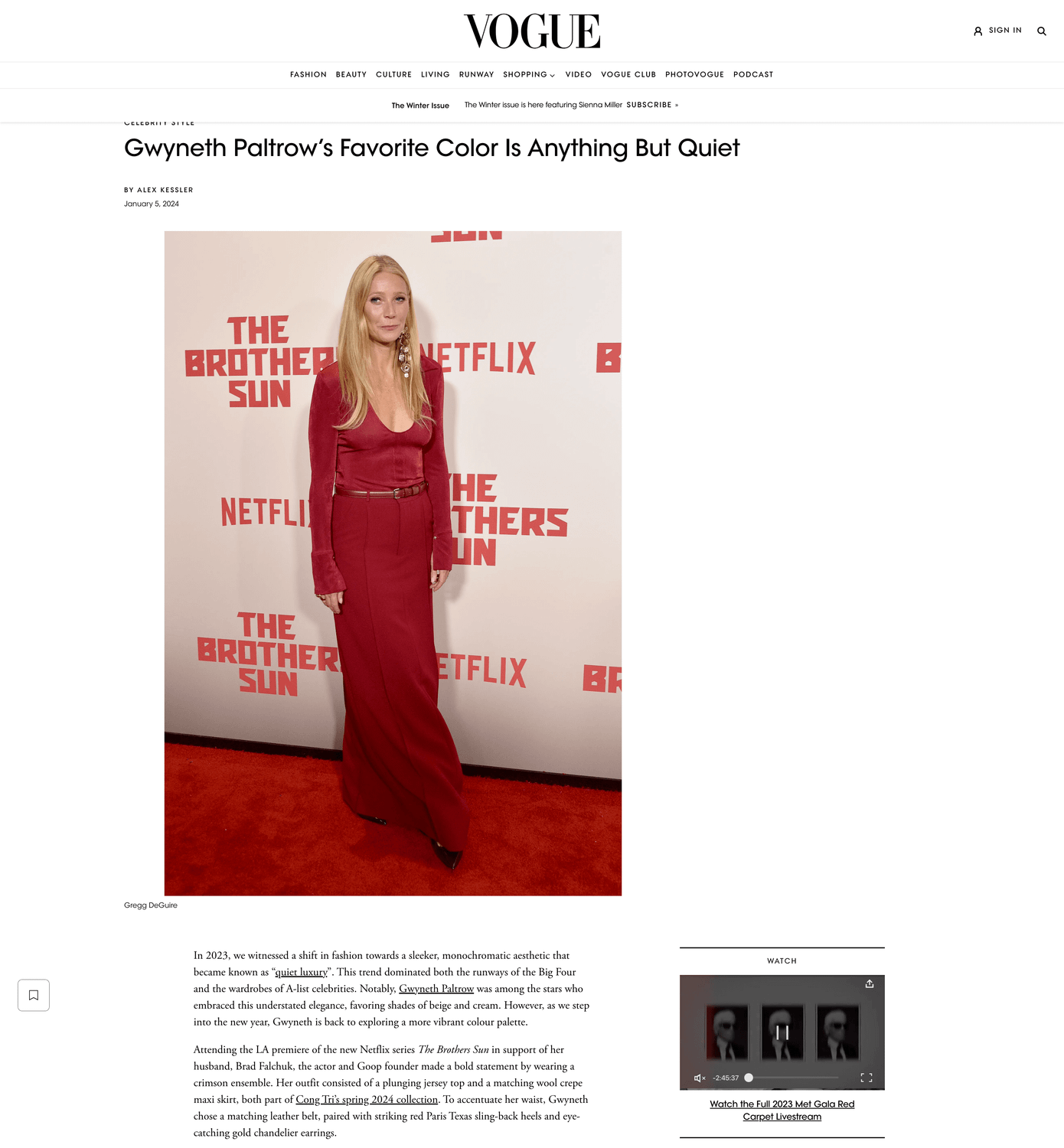 Trong khi đó, Vogue Mỹ lại đề cao lần tái xuất này của Gwyneth Paltrow khi chọn phong cách “sang trọng thầm lặng” (quiet luxury) mà cả cô lẫn Công Trí đều đang theo đuổi. Gam màu đỏ đô trên nền chất liệu wool cũng giúp nữ minh tinh nổi bật giữa thảm đỏ toàn các sắc màu trung tính khác mà không hề phô trương.