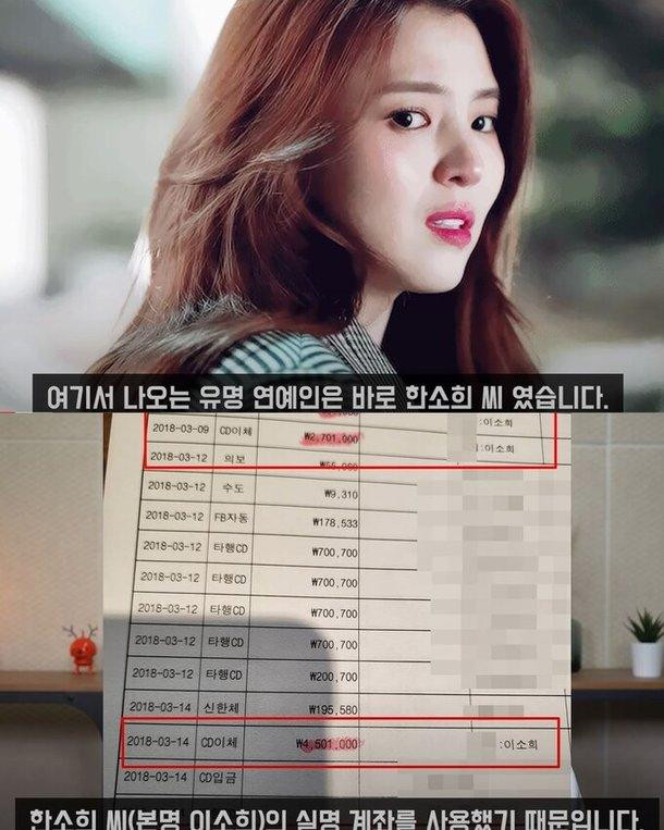 'Hung thần' YouTuber Lee Jin Ho tiết lộ mẹ của Han So Hee chính là người phụ nữ bị tố cáo. Theo lời người này, bà đã vay tiền vào một tài khoản ngân hàng do con gái đứng tên, tài khoản này được lập khi Han So Hee còn vị thành niên và do bà quản lý. Bà sử dụng tài khoản của con gái mình trong vài tháng trong khi tài khoản của bà không có sẵn để giao dịch.