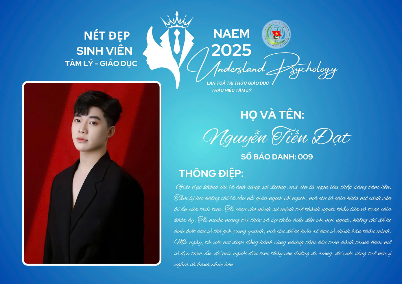 | Nguyễn Tiến Đạt đăng quang Cuộc thi Nét đẹp Sinh viên Tâm lý - Giáo dục 2025. |
