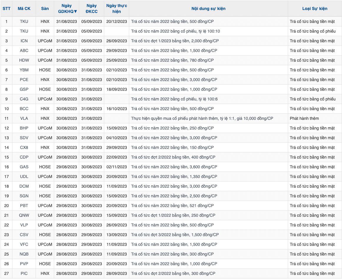Cũng trong ngày 30/8, Công ty Cổ phần Phân bón Dầu khí Cà Mau (mã DCM) sẽ chốt danh sách cổ đông chi trả cổ tức năm 2022 bằng tiền với tỷ lệ chi trả 30%, tương ứng cổ đông sở hữu 1 cổ phiếu được nhận về 3.000 đồng. Thời gian thanh toán là ngày 11/9/2023.
