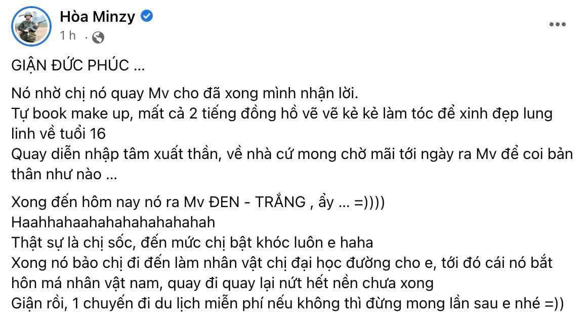 "Bóc phốt" cậu em thân thiết trên trang cá nhân, Hòa Minzy cho biết: "Nó nhờ chị nó quay MV cho đã xong mình nhận lời. Tự book make-up, mất cả 2 tiếng đồng hồ vẽ vẽ kẻ kẻ làm tóc để xinh đẹp lung linh về tuổi 16. Quay diễn nhập tâm xuất thần, về nhà cứ mong chờ mãi tới ngày ra MV để coi bản thân như nào… Xong đến hôm nay nó ra MV ĐEN - TRẮNG".