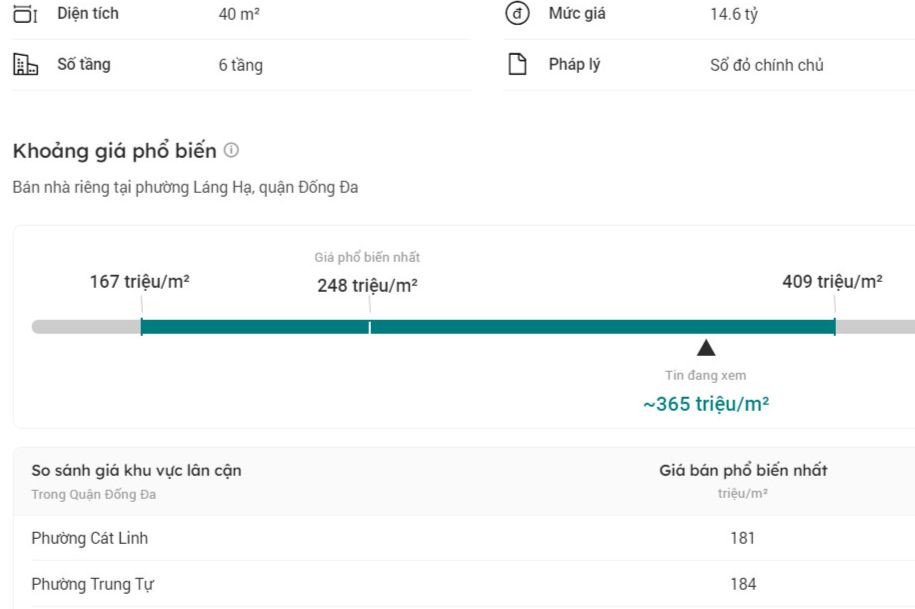 Đối với khu vực trung tâm như quận Đống Đa, một căn nhà 6 tầng, diện tích 40m2 trong ngõ rộng 6m tại đường Nguyễn Chí Thanh đang được rao bán với giá 14,6 tỷ đồng, tương đương 365 triệu đồng/m2. Người dân xung quanh cho biết, giá nhà khu vực này trước đó chỉ trong khoảng 280 – 340 triệu đồng/m2.
