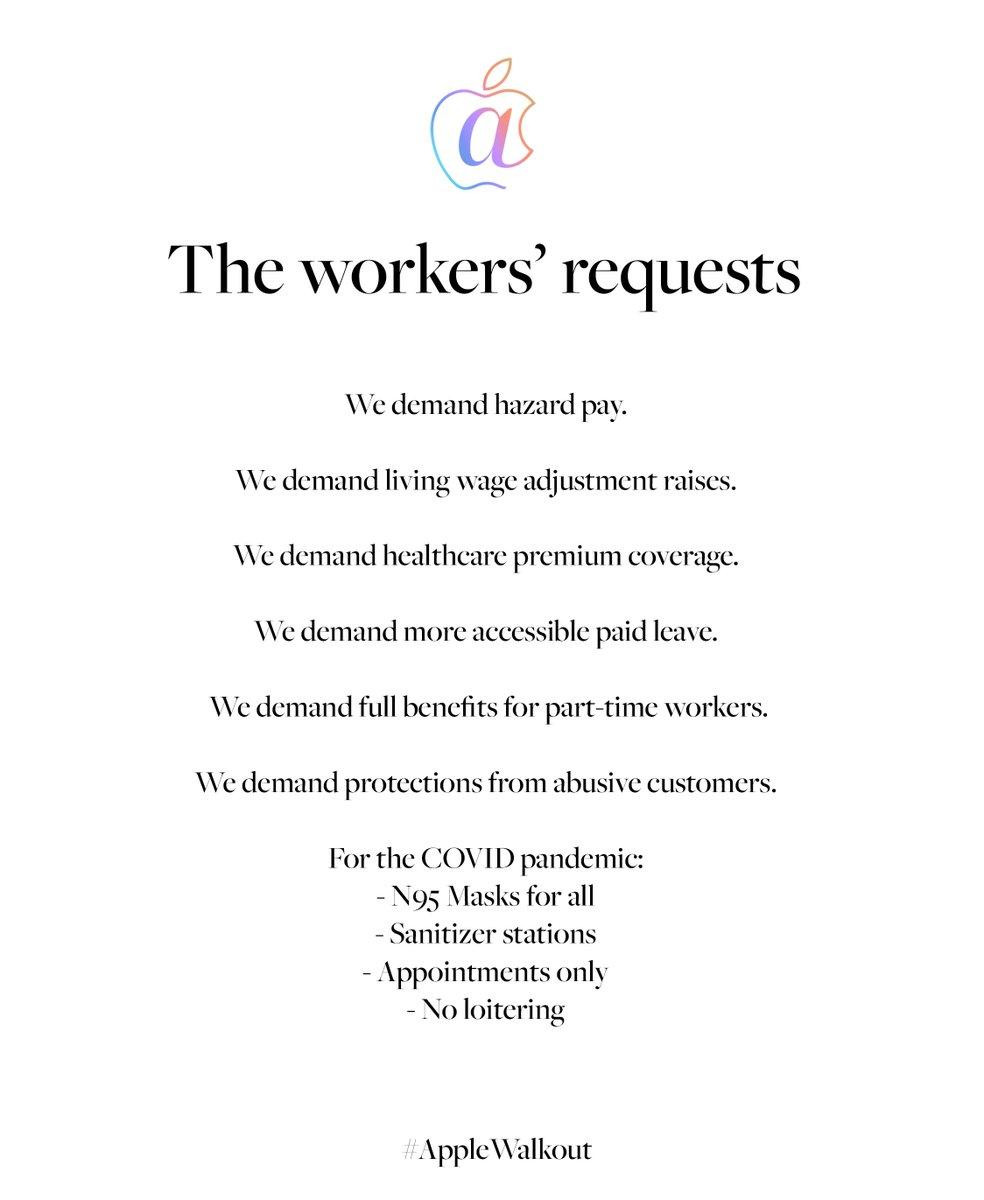 Thông qua lời kêu gọi trên tweet của mình, họ yêu cầu trả lương nghỉ ốm, tăng lương, trả phí bảo hiểm chăm sóc sức khỏe và phải được nghỉ phép có lương. Họ cũng đòi quyền lợi đầy đủ cho những nhân viên làm việc bán thời gian và yêu cầu tất cả nhân viên phải được bảo vệ trước sự bắt nạt từ những vị khách hàng quá đáng.