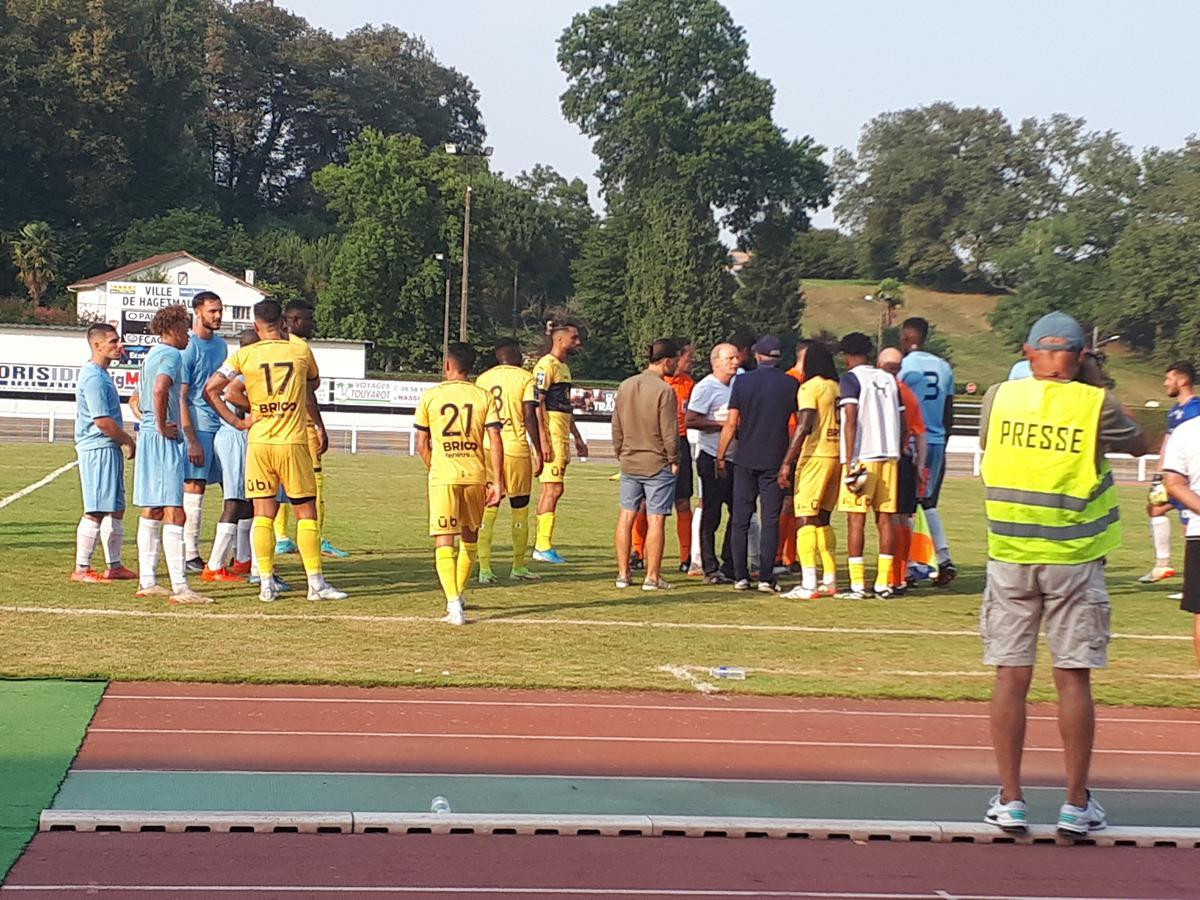 Tuy nhiên, trận đấu trở nên kém hấp dẫn vì những quyết định nặng tay của vị trọng tài chính. Phút 19, Sylvestre có pha phạm lỗi chỉ đáng nhận thẻ vàng nhưng trọng tài Monsieur Chanel quyết định rút thẻ đỏ đuổi cầu thủ của Pau FC. Đội trưởng Batisse đến phân trần và cũng bị nhận thẻ vàng.