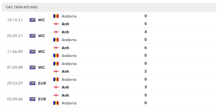 Lịch sử đối đầu, phong độ Andorra vs Anh