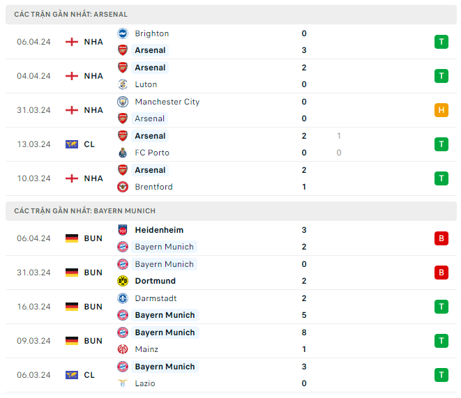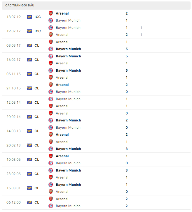 Phong độ, lịch sử đối đầu Arsenal vs Bayern Munich