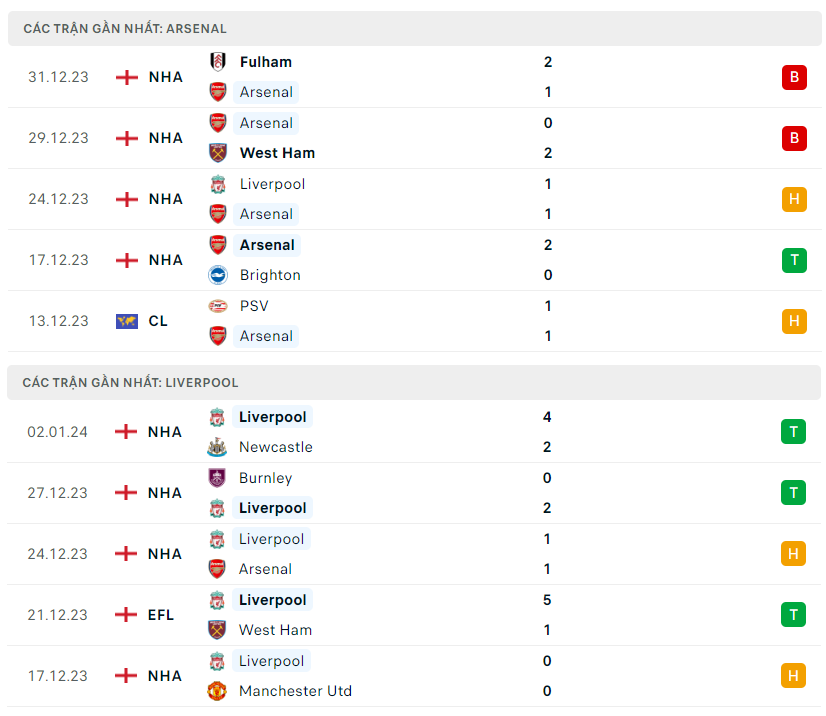 Lịch sử đối đầu, phong độ Arsenal vs Liverpool