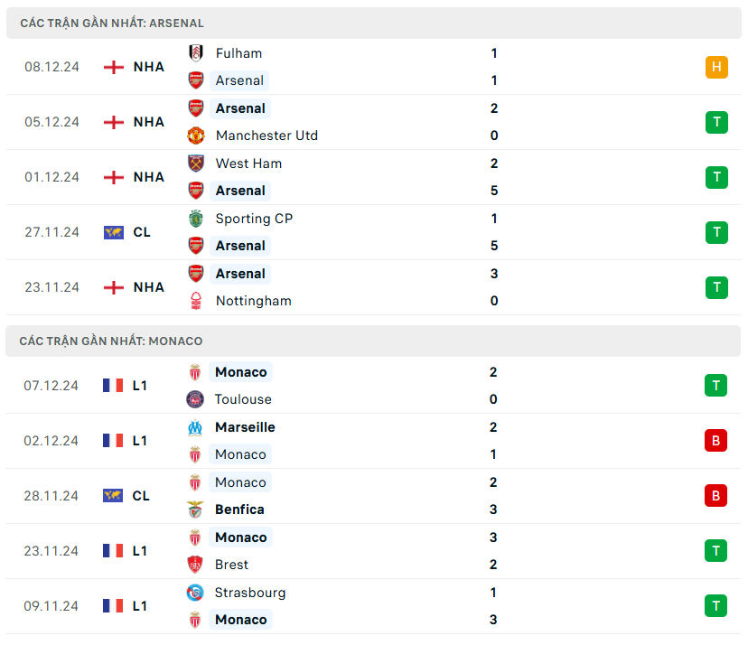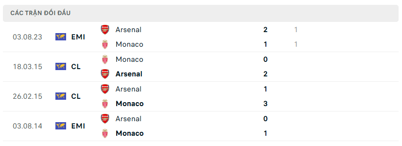 Phong độ, lịch sử đối đầu Arsenal vs Monaco