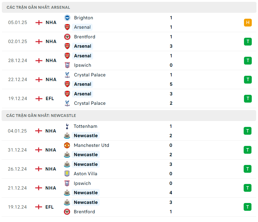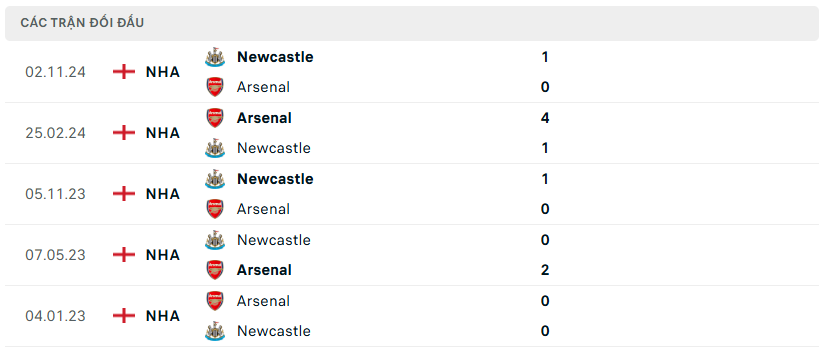 Lịch sử đối đầu, phong độ Arsenal vs Newcastle