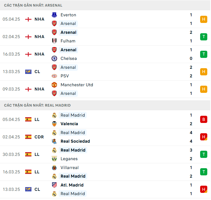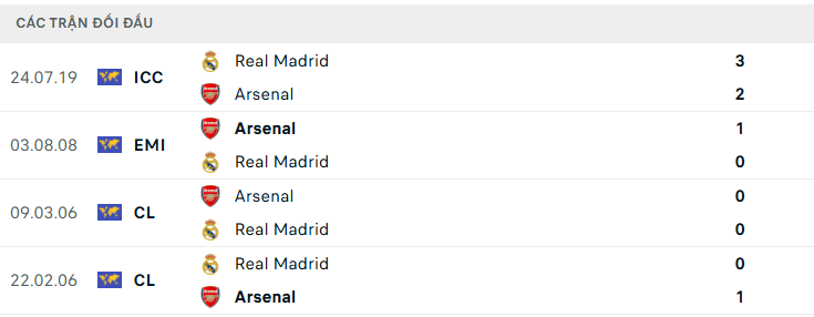 Lịch sử đối đầu, phong độ Arsenal vs Real Madrid