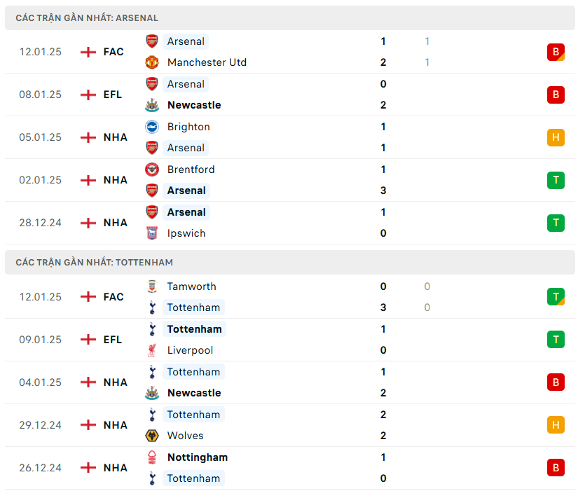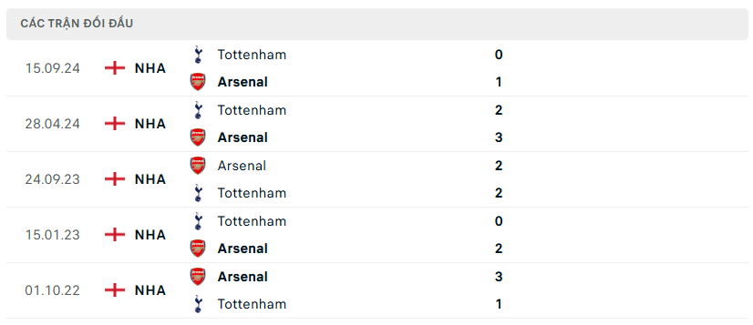 Lịch sử đối đầu, phong độ Arsenal vs Tottenham