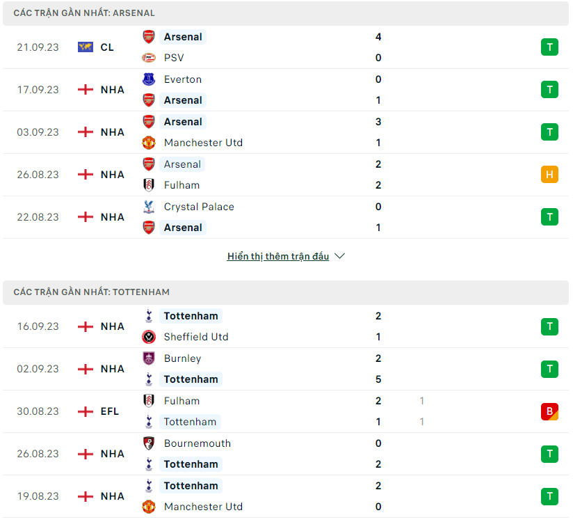 Lịch sử đối đầu, phong độ Arsenal vs Tottenham