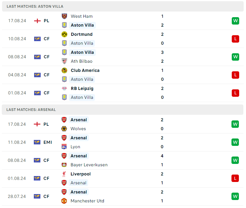 Lịch sử đối đầu, phong độ Aston Villa vs Arsenal