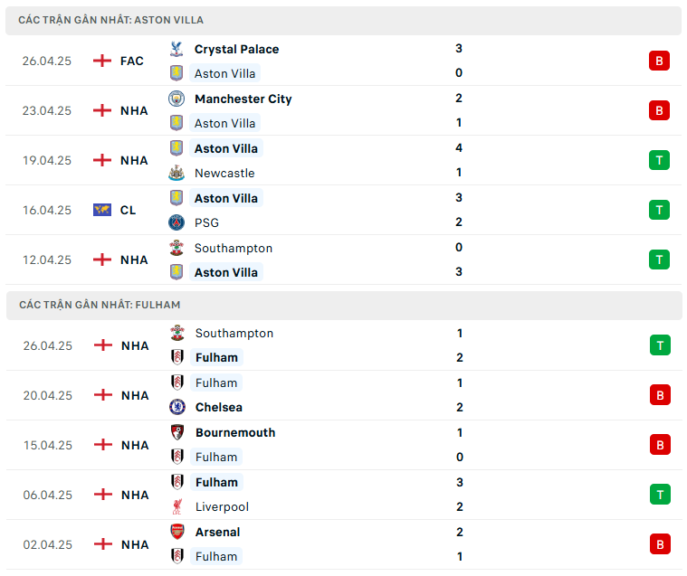 Lịch sử đối đầu, phong độ Aston Villa vs Fulham