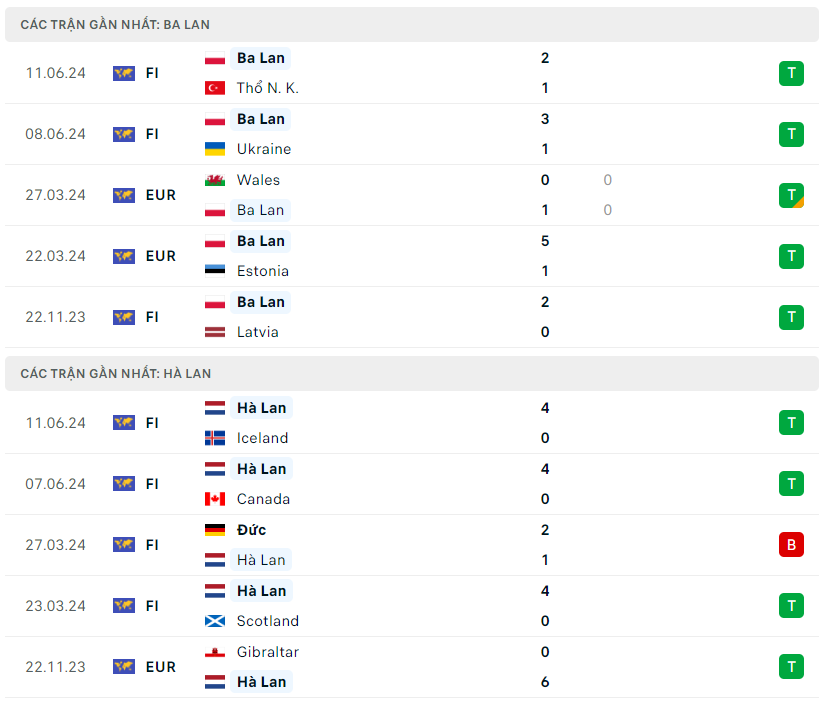 Ba Lan không thắng trong 12 lần gặp Hà Lan gần nhất trên mọi đấu trường (hòa 5, thua 7), kể từ chiến thắng 2-0 trên sân nhà ở vòng loại EURO 1980. Cuộc đụng độ gần đây nhất giữa hai đội này đã kết thúc với chiến thắng 2-0 cho Oranje - khi đó được dẫn dắt bởi Louis van Gaal - vào tháng 9 năm 2022 tại Nations League. Hai cầu thủ ghi bàn khi đó là Cody Gakpo và Steven Bergwijn đều góp mặt tại EURO 2024.