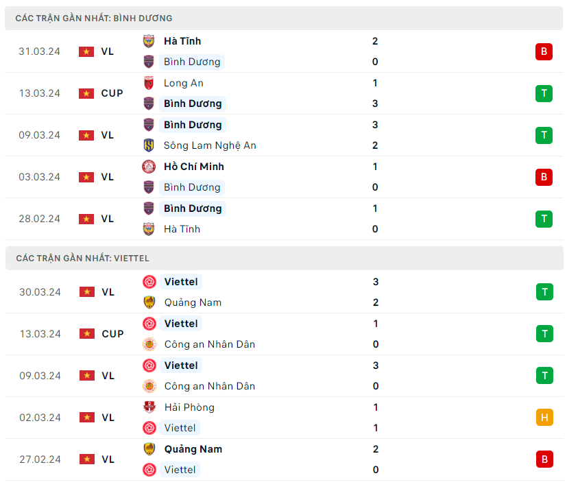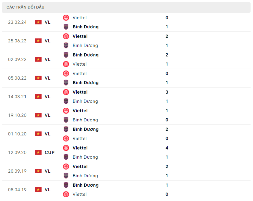 Lịch sử đối đầu, phong độ Becamex Bình Dương vs Thể Công Viettel