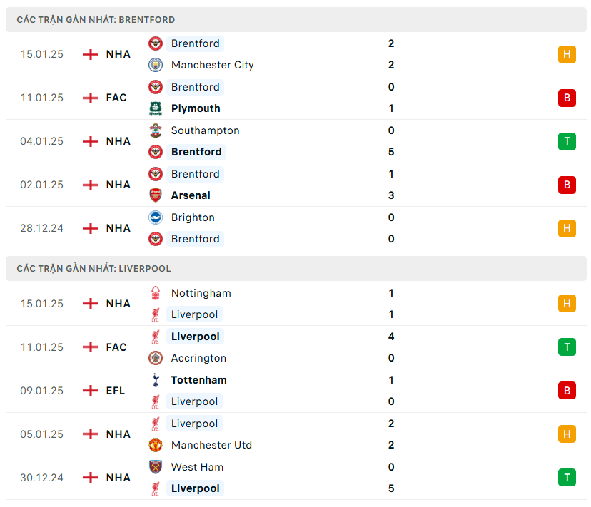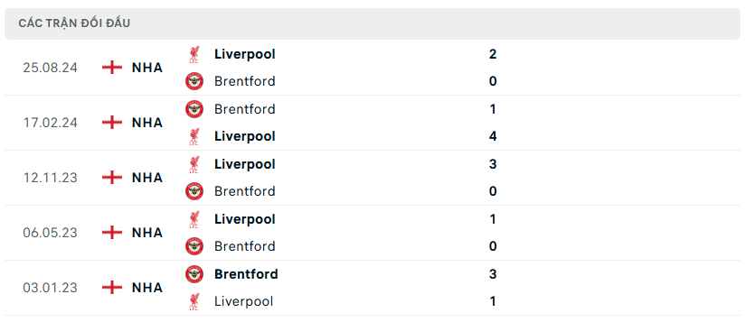 Lịch sử đối đầu, phong độ Brentford vs Liverpool