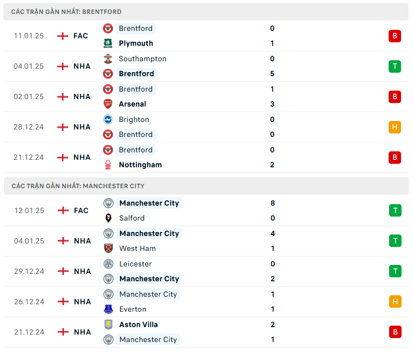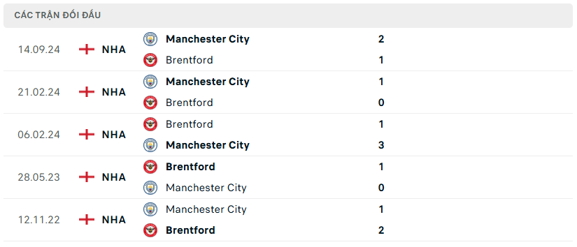 Lịch sử đối đầu, phong độ Brentford vs Man City