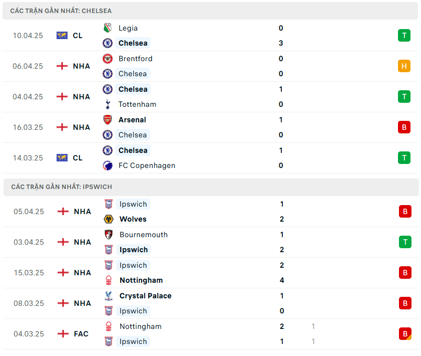 Lịch sử đối đầu, phong độ Chelsea vs Ipswich Town