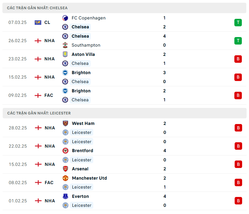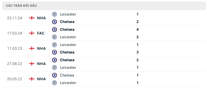 Lịch sử đối đầu, phong độ Chelsea vs Leicester City