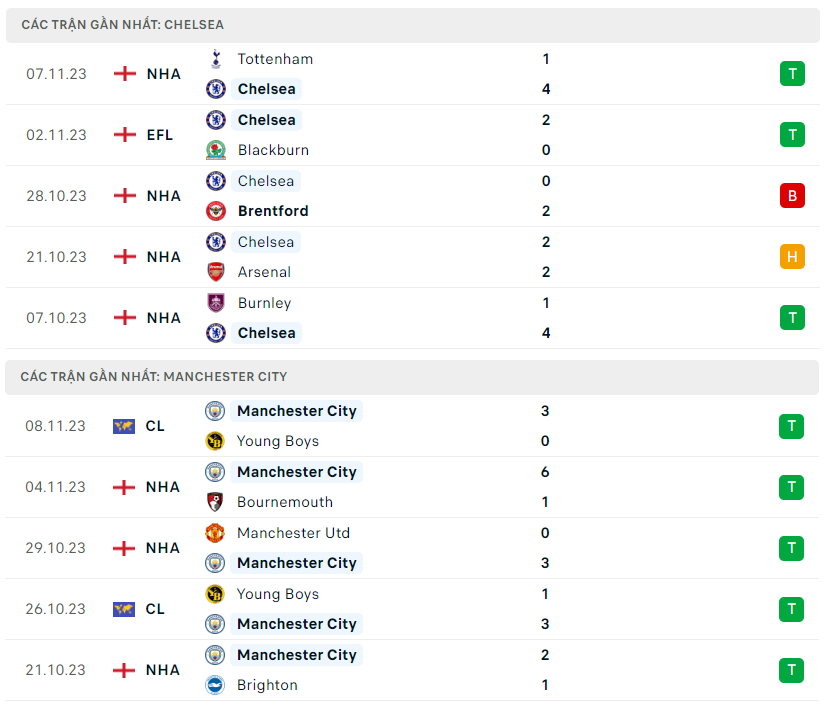 Lịch sử đối đầu, phong độ Chelsea vs Man City