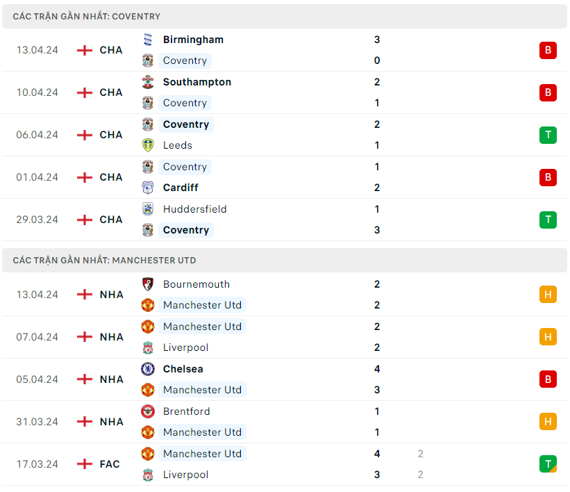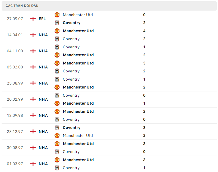 Lịch sử đối đầu, phong độ Coventry vs MU
