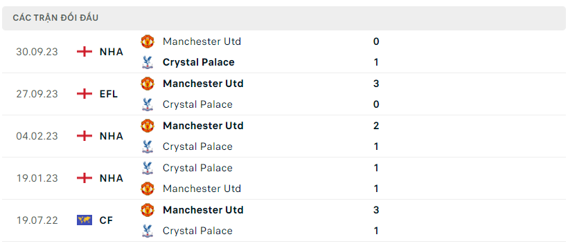 Lịch sử đối đầu, phong độ Crystal Palace vs MU