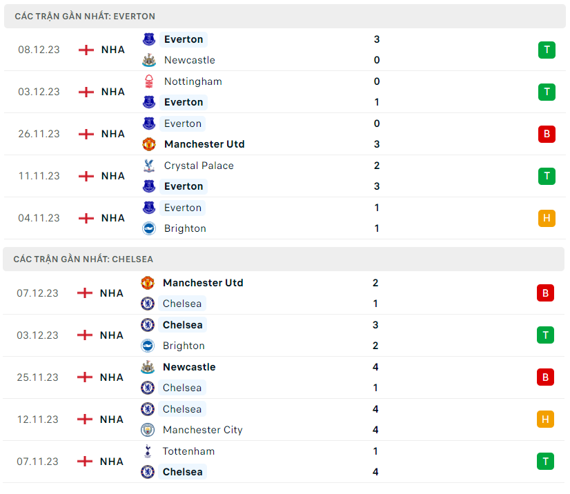 Lịch sử đối đầu, phong độ Everton vs Chelsea