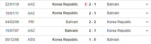 Theo thống kê, Hàn Quốc và Bahrain đã đối đầu tổng cộng 5 lần trước đây. Lợi thế nghiêng về phía ‘Mãnh hổ’ châu Á với 3 chiến thắng, 1 trận hoà và 1 thất bại. Lần gần nhất hai đội gặp nhau cũng là một trận đấu thuộc khuôn khổ Asian Cup. Trong trận đấu đó, Hàn Quốc đã giành chiến thắng sát nút 2-1 trước Bahrain.