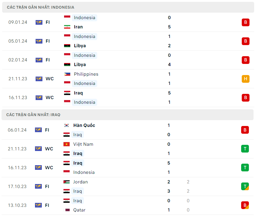 Lịch sử đối đầu, phong độ Indonesia vs Iraq
