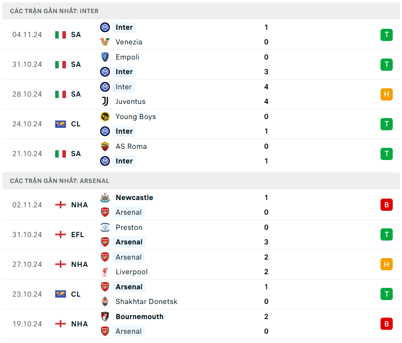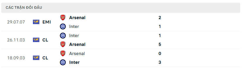 Lịch sử đối đầu, phong độ Inter Milan vs Arsenal