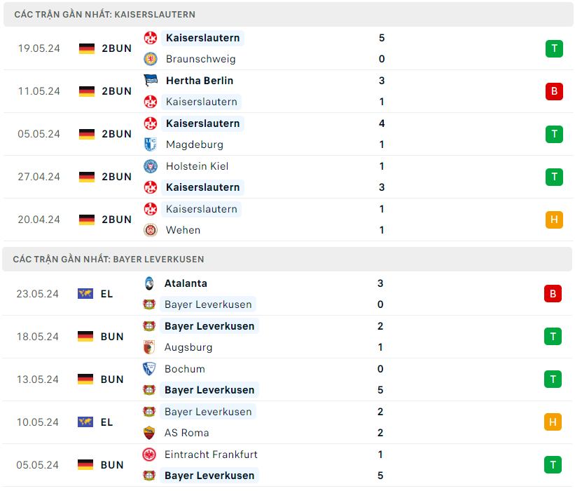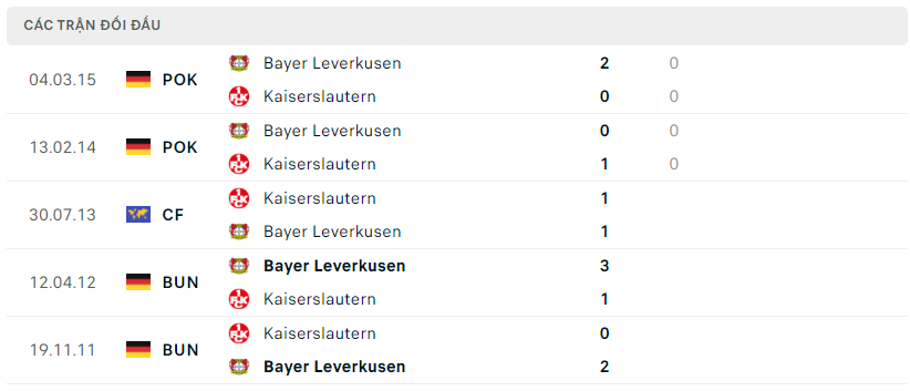 Lịch sử đối đầu, phong độ Kaiserslautern vs Leverkusen