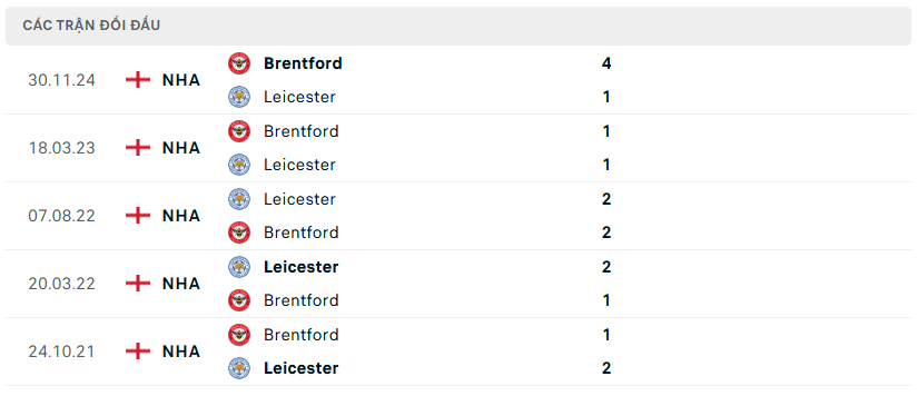 Lịch sử đối đầu, phong độ Leicester City vs Brentford