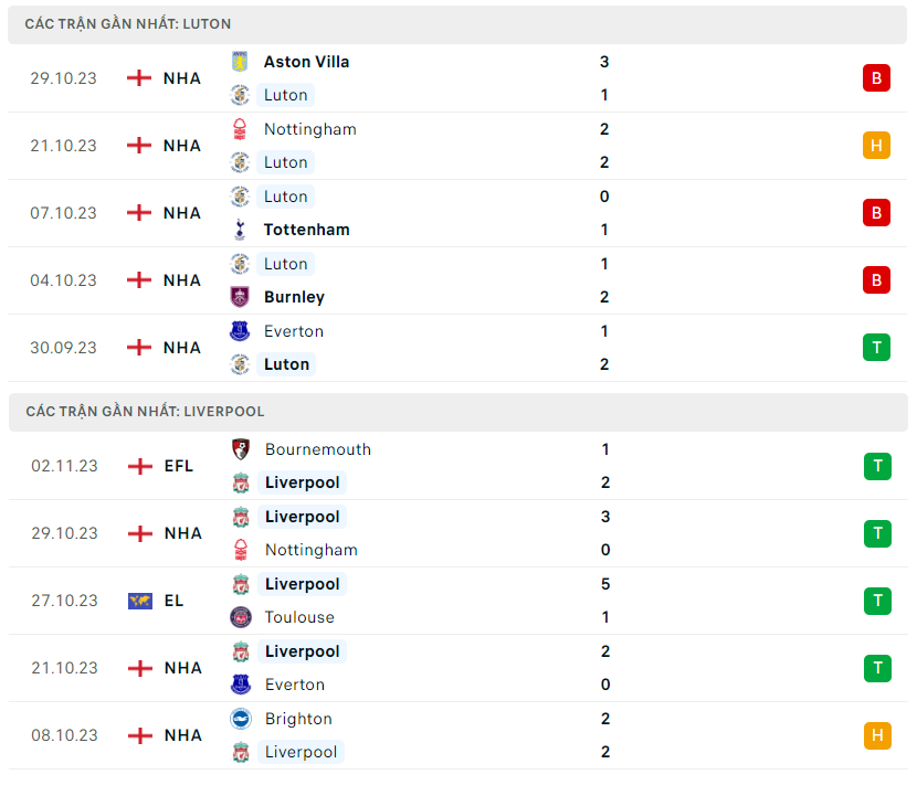 Lịch sử đối đầu, phong độ Luton vs Liverpool