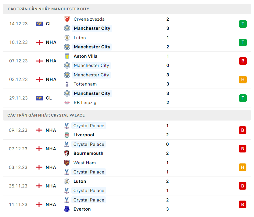 Lịch sử đối đầu, phong độ Man City vs Crystal Palace