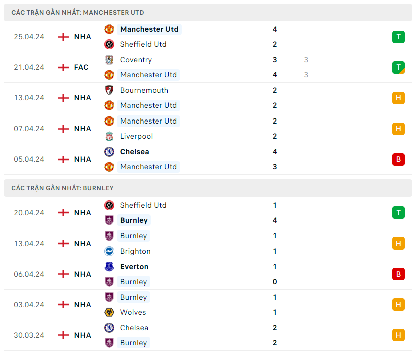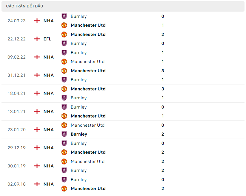 Lịch sử đối đầu, phong độ MU vs Burnley