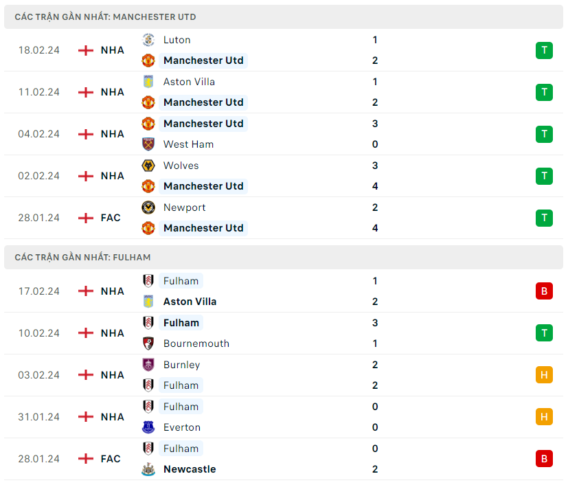 Lịch sử đối đầu, phong độ MU vs Fulham