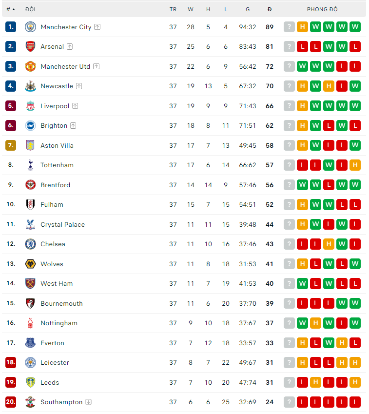 Bảng xếp hạng Ngoại hạng Anh trước vòng 38