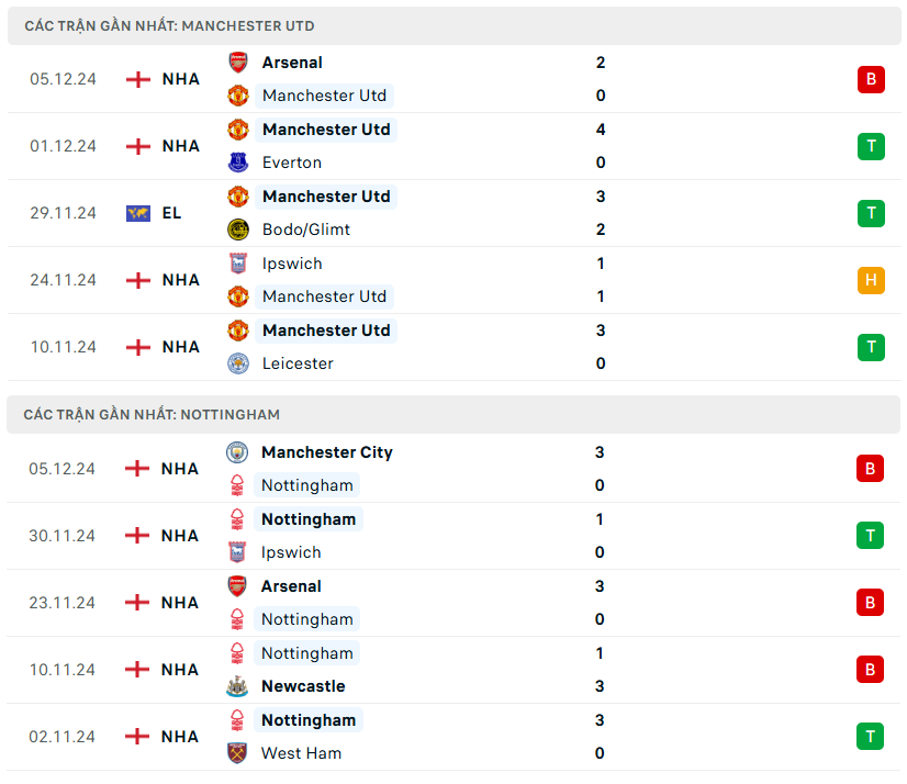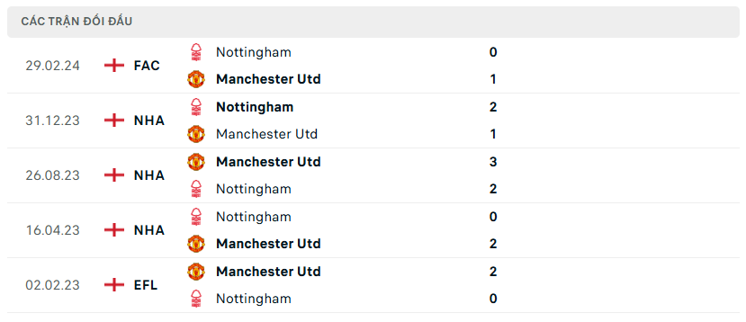 Lịch sử đối đầu, phong độ MU vs Nottingham