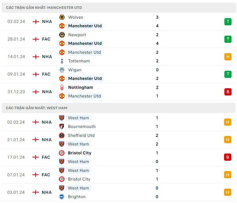 Tính riêng trong năm mới 2024, MU đang có phong độ rất cao khi bất bại 4 trận (thắng 3, hòa 1). Họ cũng chỉ bị đối thủ mạnh là Tottenham cầm hòa 2-2. Ngược lại, West Ham không biết mùi thắng kể từ khi gây sốc trước Arsenal vào cuối năm 2023. Đội bóng của David Moyes đã có 5 trận liên tiếp không biết thắng (hòa 4, thua 1) và rất khó cho họ tạo ra bất ngờ tại Old Trafford.