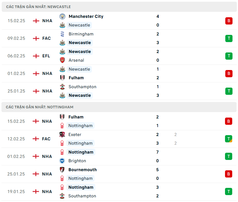 Kể từ khi Nottingham trở lại Ngoại hạng Anh vào năm 2022, họ đã gặp Newcastle tổng cộng 6 lần trên mọi đấu trường và thua đến 5 trận. Rất khó cho Nottingham thay đổi tình hình với phong độ hiện nay. Trong 5 trận gần nhất tại Ngoại hạng Anh, Nottingham thắng 2, hoà 1 thua 2. Dù vậy, họ cũng có khả năng tạo ra bất ngờ khi Newcastle thiếu ổn định không kém.