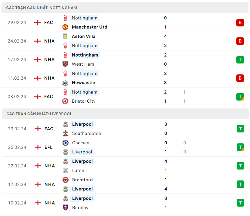 Lịch sử đối đầu, phong độ Nottingham vs Liverpool