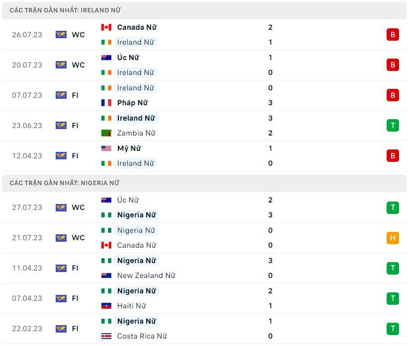Phong độ, lịch sử đối đầu nữ Ireland vs nữ Nigeria