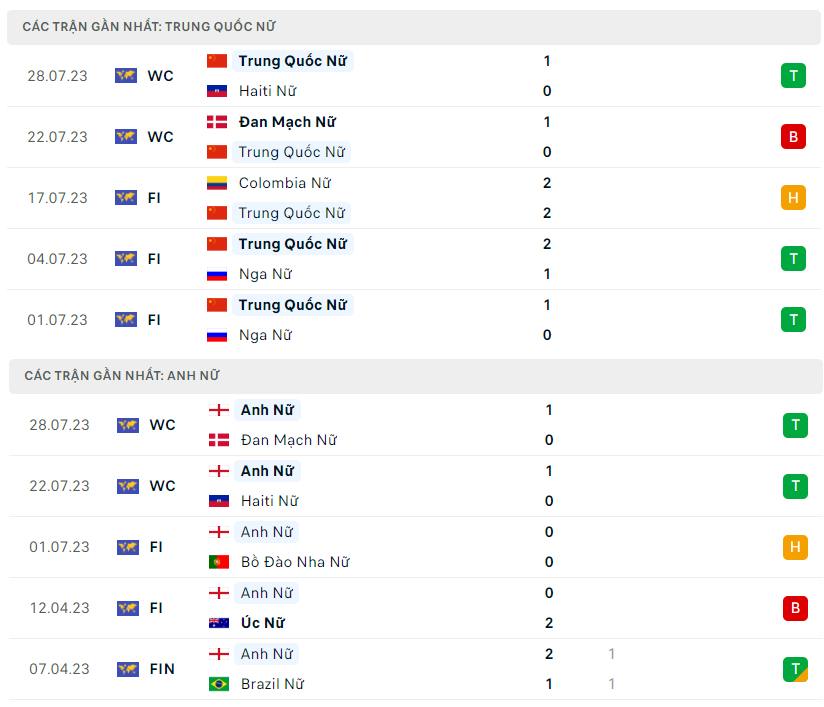 Phong độ, lịch sử đối đầu nữ Trung Quốc vs nữ Anh