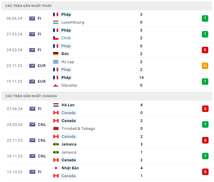 So với Luxembourg, Canada là đội bóng mạnh hơn đáng kể. Dù vậy, Canada rõ ràng không phải đối thủ của Pháp. Họ vừa thảm bại 0-4 trước Hà Lan và nhiều khả năng sẽ tiếp tục thua đậm ở trận này khi Les Bleus muốn có bước chạy đà hoàn hảo nhất cho EURO 2024.