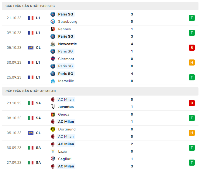 Phong độ, lịch sử đối đầu PSG vs AC Milan