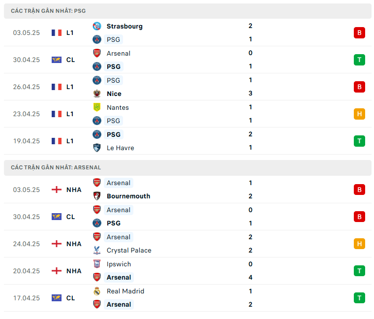Lịch sử đối đầu, phong độ PSG vs Arsenal