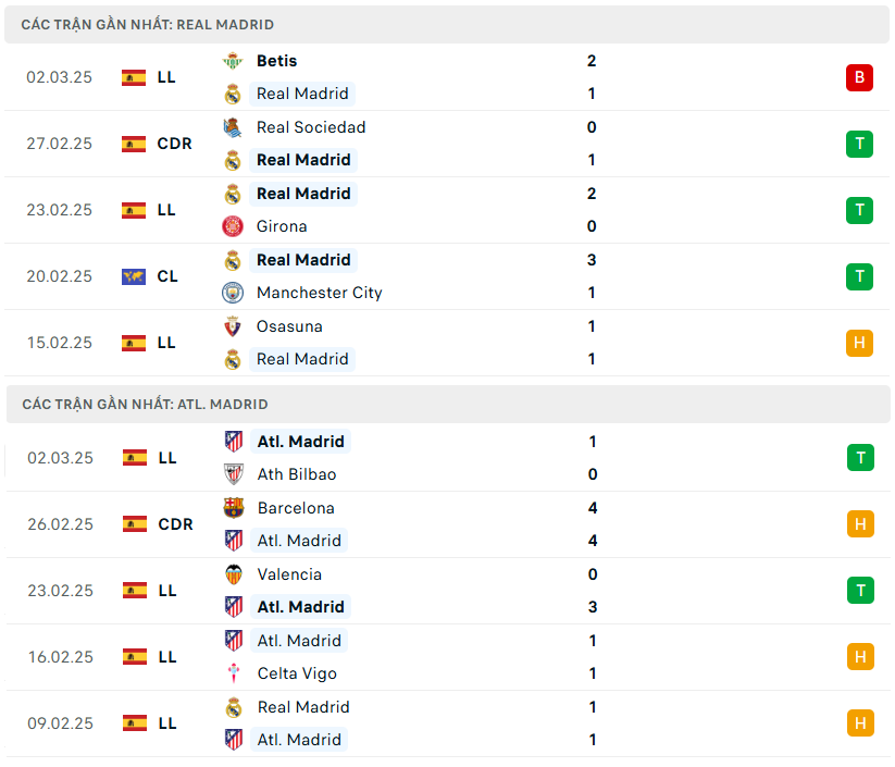 Lịch sử đối đầu, phong độ Real Madrid vs Atletico Madrid